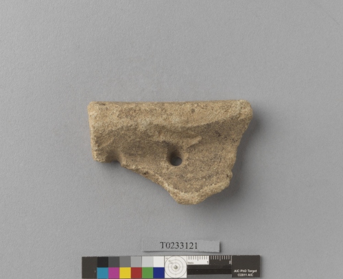 形制:捲瓣石刀,米白色,由砂岩磨製而成,周緣經修整,近三角形,上方厚、做為把手,下端薄,背面中央微凹,把手下方有兩個平行的穿孔。刃部殘失。