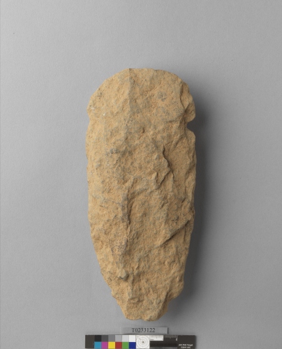 形制:斧鋤形器,土褐色,由砂岩打製而成,周緣經修整,近長橢圓形,雙面修整近平,頂部圓弧,刃部較窄、平、且有消耗痕。