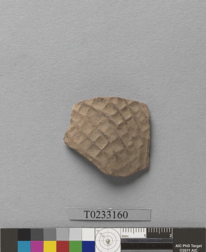 作者不詳(鐵器時代)。[遺物:方格印紋夾砂陶腹片]。《數位典藏與數位學習聯合目錄》。http://catalog.digitalarchives.tw/item/00/85/b3/a3.html(2026/04/17瀏覽)。
