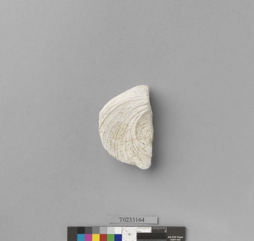 形制:夜光蠑螺口蓋,僅存部分,表面風化。