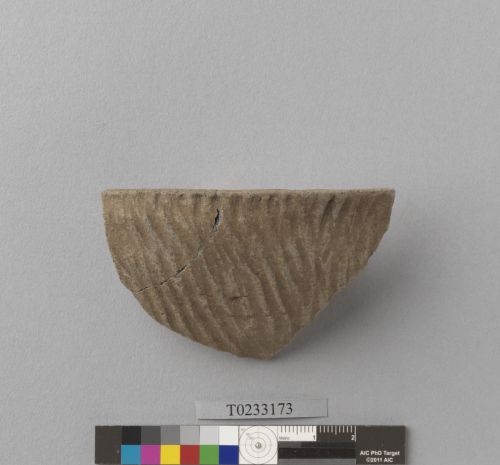 形制:褐色夾砂陶缽口緣,歛口、無唇、口部平,外側印有條紋,表面風化,由2片殘片拼合而成。屬鐵器時代十三行文化普洛灣類型的遺物。
