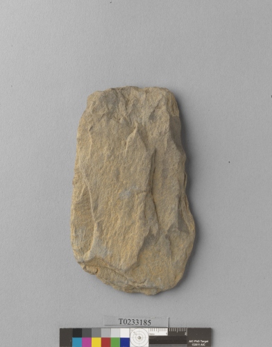 形制:石斧,灰褐色,由砂岩打製而成,周緣經修整,近長方形,雙面修整近平,頂部平,刃部圓弧、有消耗痕。