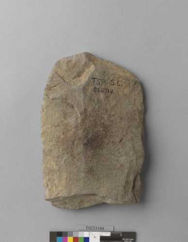 形制:斧鋤形器,灰褐色,由砂岩打製而成,周緣經修整,近長方形,雙面修整近平,頂部尖,刃部殘失。