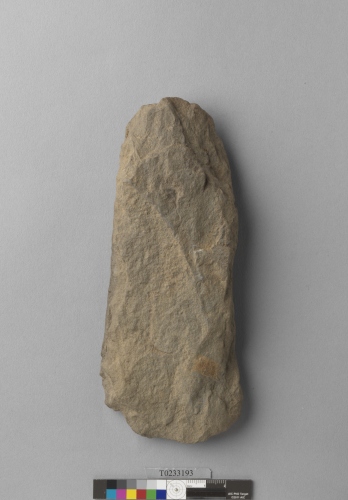 形制:石斧,灰褐色,由砂岩打製而成,周緣經修整,近長方形,雙面修整近平,頂部尖,刃部圓弧、有消耗痕。