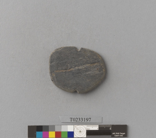 形制:網墜,灰色,由板岩卵石製成,呈薄片狀、近橢圓形。全器經修磨,器表光滑。中央有一組縱向缺刻。
