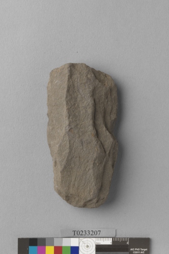 形制:石斧,灰褐色,由砂岩打製而成,周緣經修整,近長方形,正面圓鼓,背面修整近平,兩端圓弧,刃部有消耗痕。
