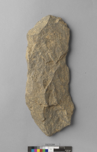 形制:灰褐色,經打製的砂岩,周緣經修整,近長方形,背面修整近平。