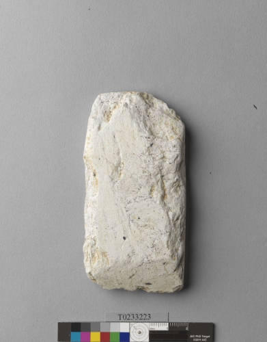 形制:錛,白色,由玉打製後修磨而成,周緣經修整,近長方形,兩端平,刃部正面修磨出面,雙面修整近平。刃部有消耗痕。