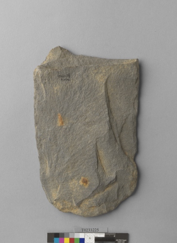 形制:石斧,灰色,由砂岩打製而成,周緣經修整,近長方形,刃部圓弧,雙面修整近平。頂部殘失,刃部有消耗痕。