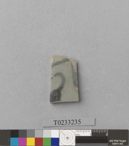 形制:青花瓷腹片,胎灰,內外側皆上透明釉。外側以青花繪紋飾,殘損無法辨識。