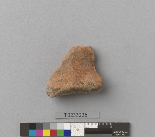 形制:紅色夾砂陶口緣,侈口,素面無紋,表面風化。屬新石器時代晚期丸山文化的遺物。