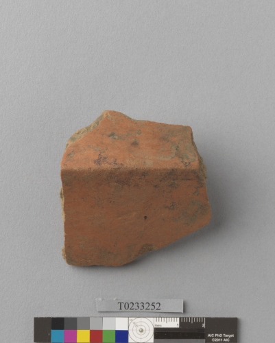形制:磚紅色夾細砂陶折肩,質地細密,燒成溫度高。素面無紋,表面風化。屬新石器時代晚期丸山文化的遺物,具臺北圓山文化龜子山類型典型的特色。