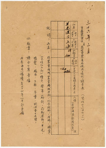 作者不詳(年代不詳)。[冊名:重慶市重要農業生產器材暨農產品進出口情形調查表]。《數位典藏與數位學習聯合目錄》。http://catalog.digitalarchives.tw/item/00/85/b6/8c.html(2026/03/31瀏覽)。