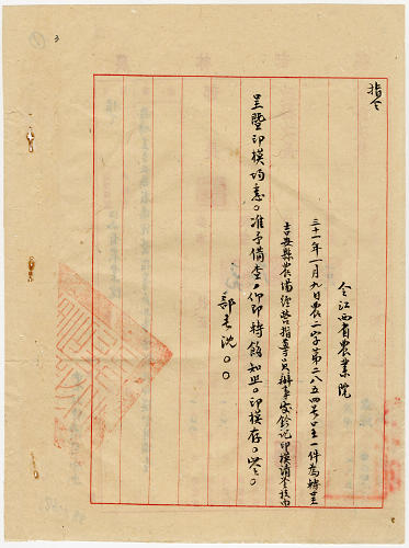 作者不詳(1942-01)。[冊名:吉安農場經營指導員辦事處鈐記、印模]。《數位典藏與數位學習聯合目錄》。http://catalog.digitalarchives.tw/item/00/85/b8/4e.html(2026/03/31瀏覽)。